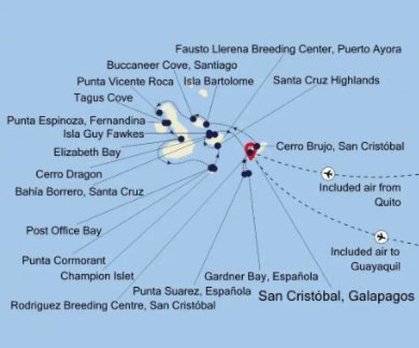 Групповой трансфер из отеля в аэропорт для вылета чартерным рейсом на Галапагосские острова. В Сан-Кристобале групповой трансфер в порт и посадка на судно Silver Origin. Отправление в круиз.