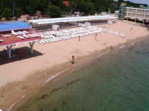 собственный, оборудованный, в 800 м, доставка на пляж автобусом санатория.