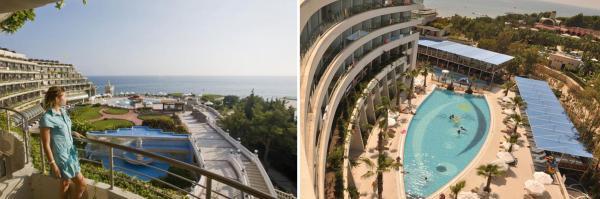 Оригинальным решением при строительстве отеля было разместить рестораны, бары, бассейны, террасы с водопадами и клумбами на разных уровнях - каскадах. Комнаты, каждая со своими округлой формы балконом, расположены на разных уровнях здания отеля, создают образ многогранной ракушки. Стандартные номера расположены в главном корпусе отеля и в 80% имеют вид на море. Семейные номера расположены в отдельном корпусе, примыкающему к аква парку и мини клубу с детской площадкой. На каждом уровне отеля расположены особенные ступенчатой формы небольшие террасы. Терраса с релакс бассейном, терраса с главным рестораном под открытым небом, терраса с рестораном ala carte, откуда отрывается удивительная панорама на море и античный Сиде. Вдоль отеля пролегает красивейшая набережная, ведущая к центру Античного Сиде.