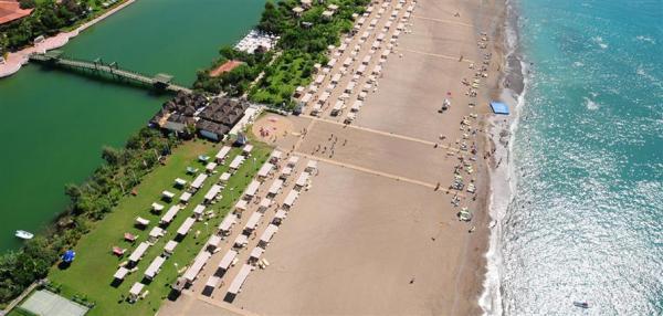 Расстояние до центра города: 3 км. Белек, 45 км. Анталия. Песчаный пляж 1 - я линия, проход на пляж по мосту через небольшую речку.6 бассейнов. Пляжный отель, Конференц - отель, Отель для семейного отдыха, Бизнес - отель