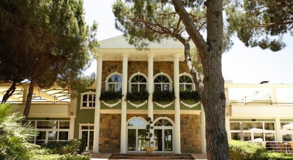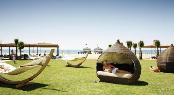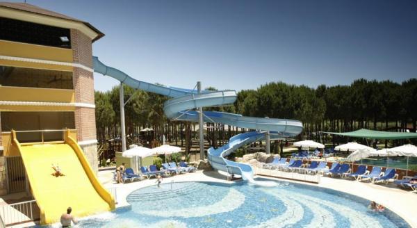 Расстояние до пляжа 150 м. Длина пляжной полосы 1 км, есть платформа. 5 бассейнов, 1 горка для взрослых и 2 горки для детей, 6 теннисных кортов с ковровым покрытием. Отель для семейного отдыха