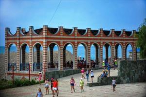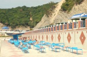 В 30 м от лагеря. Пляж — песчано-галечный, оборудованный : туалеты, душевые кабинки, теневые навесы, шезлонги, работает спасательная служба, имеется лодка со спасательным оборудованием. Обустроенная набережная с беседками, спуском к морю, газонами и фонтанами.