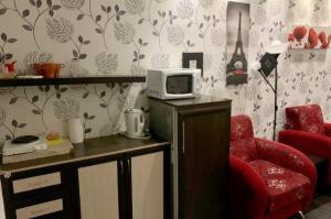 мини-кухней, холодильник, большой телевизор, кожаные диваны, спальня с