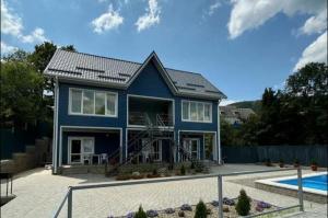 В восьмиместных номерах большая обеденная зона с раскладывающимся столом. Один восьмиместный номер с общей четырехместной спальней, второй восьмиместный номер с двумя раздельными двухместными спальнями на втором этаже номера. На первом этаже каждого восьмиместного номера по два больших раскладных дивана. На первом этаже гостевого дома есть общая кухня. На террасе столы и стулья. На территории гостевого дома бассейн, шезлонги, беседки, мангалы и мангальные принадлежности. Стоянка на территории под видеонаблюдением.