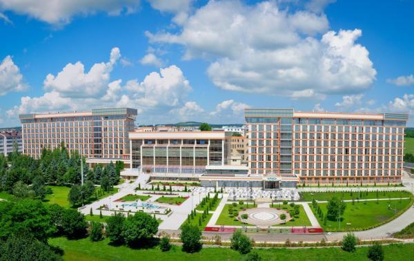Комплекс занимает обширную территорию площадью почти 6,5 гектаров и включает в себя два 9-этажных спальных корпуса, лечебный блок, здание с рестораном и спортивно-оздоровительный центр с бассейном и спа. Все сооружения объединены между собой переходами. Территория санатория благоустроена, есть зона отдыха, аллеи для прогулок и собственный бювет. Обширный жилой фонд, рассчитанный на единовременное размещение 730 человек, предлагает отдыхающим номера разной категории — от Стандарта до Апартаментов. Во всех номерах современный минималистичный интерьер, выдержанный в пастельной гамме с использованием приятных шоколадных оттенков, удобная мебель. Комнаты оснащены сплит-системой, есть санузел с душем и необходимая техника. Из окон открываются панорамные виды на вершину Эльбрус и Кавказский хребет.