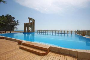 Собственный, оборудованный галечный протяженностью 320 м. На пляже - бар «Белый медведь», кафе у моря, аэрарии, солярии, лодочная станция.