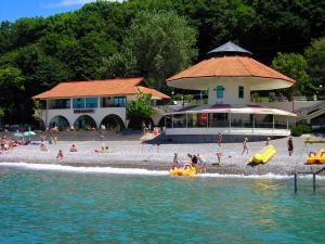 Пляжный комплекс пансионата находится в 500 метрах. Между пляжем и пансионатом курсирует автобус. Пляжная полоса пансионата является одной из самых широких и чистых на всем побережье города Сочи.