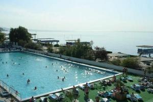 На территории пансионата открытый подогреваемый бассейн с морской водой 50м*25м.