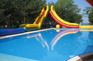 Пляж: В 50-ти метрах расположен собственный мелкогалечный пляж , у кромки воды переходящий в песок, с набережной прекрасно оборудованный (теневые навесы, шезлонги, кабинки для переодевания, душ), спасательная и медицинская служба. Надувной акватрек и водные аттракционы. Площадка для пляжного волейбола.