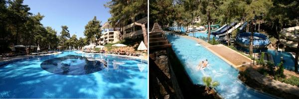 Cобственный аквапарк площадью 15.000 кв.м: 8 горок для взрослых,4 горки для детей, бассейн с горками, мини-бассейн,бассейн для отдыха, рафтинг (280м), мини-клуб, детская игровая площадка, терраса для загорания, Бар с закусками и напитками.