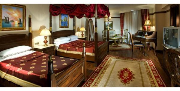 Семейный номер состоит из 2 комнат с балконом, 1 двуспальная кровать, 2 односпальные кровати и 1 диван. В семейном номере есть фен, телефон, душ/туалет. 2 LCD телевизора, 2 мини-бара, сейф, ламинат, кондиционер (центральное и временное), чайник, чай и кофе. Ежедневно: уборка номера, смена полотенец. Каждые 2 дня: смена постельного белья. (Размещение: 3 взрослых и 2 детей или 4 взрослых + 1 ребенок)