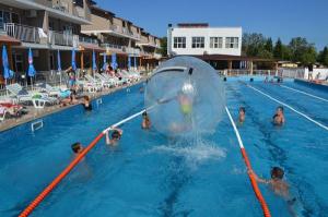 - открытый бассейн с горкой и лежаками;