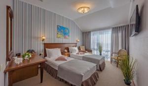 Главный корпус находится в 750 метрах от песчаного пляжа, в 14 км от центра г. Анапа, в 5 км от ж/д вокзала, в 7 км от аэропорта. На территории имеется парковка, детская площадка, бассейн, медицинский центр, спортивная площадка, тренажерный зал, банкетный зал.