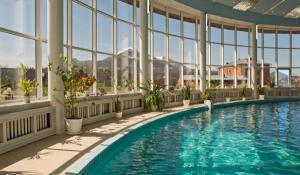 Еще одно из преимущество санатория - четыре бассейна с подогреваемой водой, один из которых оборудован элементами аквапарка, а другой с красивейшим панорамным видом на горы.