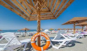 Собственный галечный оборудованный пляж "Bridge Resort" находится в 150 метрах от корпусов. На территории пляжа имеется все необходимое для комфортного отдыха: комнаты для переодевания, душевые кабины, шезлонги и зонтики.