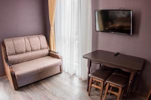 В номерах: двуспальная кровать, прикроватные тумбы, санузел, душ, фен,холодильник, телевизор с плоским экраном, чайник, шкаф, стол, диванчик.