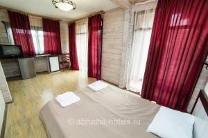 Отель расположен самом центре курортной зоны и в 400 метрах от Черноморского побережья. Проживая в отеле можно ежедневно любоваться горной рекой Псырцха прямо из панорамного окна собственного номера. Побыть в уединении с природой поможет и интересный " деревянный" дизайн отеля, который удивительно четко сочетается зеленью склонов и синевой неба.