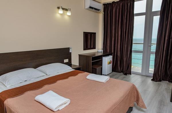 Это новая и современная, уютная и комфортабельная гостиница в центре города Гагра. Отель предлагает разместиться в шаговой доступности от моря, на первой береговой линии, в условиях со всеми удобствами по доступным ценам. Домашний уют, комфорт, качественный сервис, персональный и дружеский подход, удобное расположение – для Вашего полноценного отдыха. В оформлении гостиницы использованы спокойные теплые тона, располагающие к покою и релаксации. На последнем этаже отеля расположен ресторан с панорамным видом на побережье Черного моря! Пляж находится в 15 метрах от корпуса, оборудован собственными лежаками и зонтами, предоставляются гостям бесплатно. Вся городская инфраструктура находится в шаговой доступности! Рекомендуем !