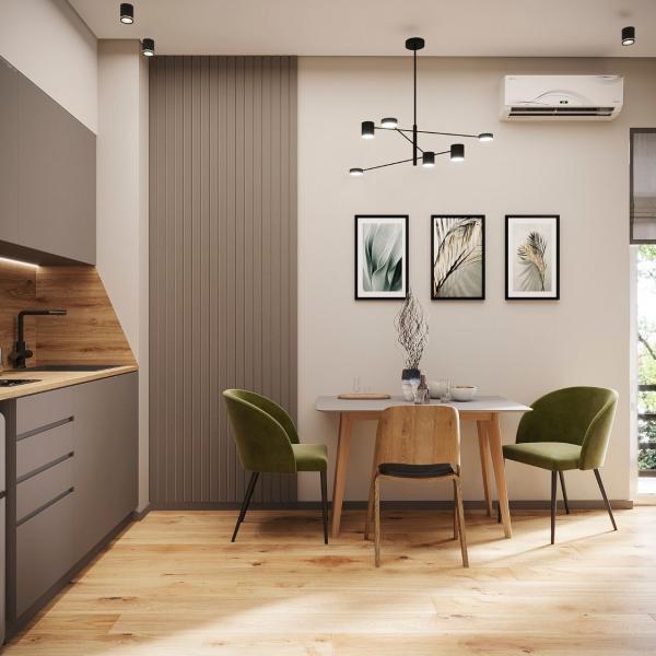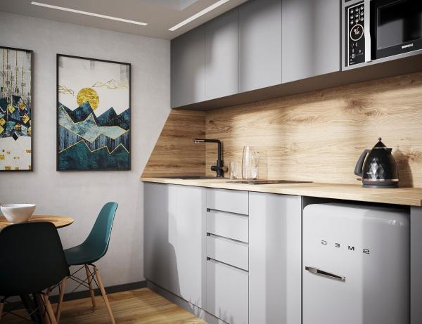 современно оформленные апартаменты, оборудованные кухонной зоной.