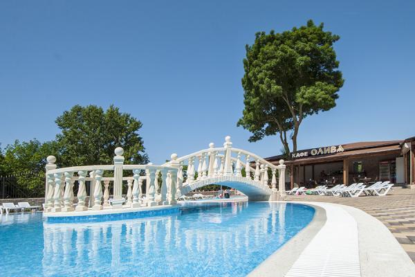 Просторный открытый бассейн оборудован декорированным мостиком, шезлонгами и