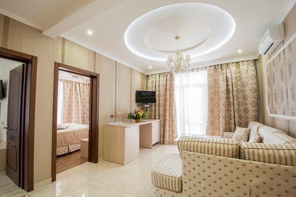 высокой категории. В цветовой гамме номеров преобладают белые, золотые и