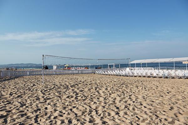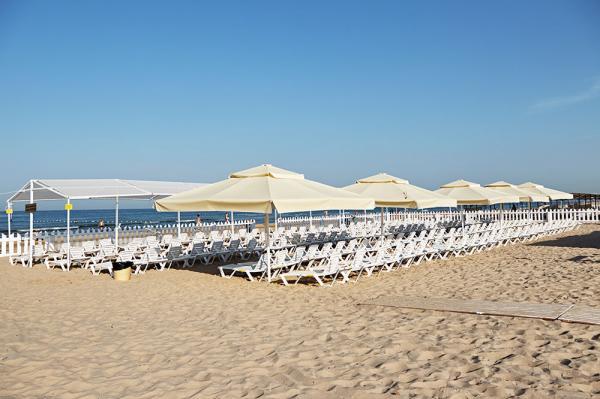 оборудован шезлонгами, теневыми навесами, душевыми кабинками и туалетом,