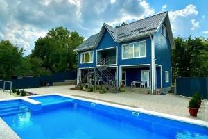В восьмиместных номерах большая обеденная зона с раскладывающимся столом. Один восьмиместный номер с общей четырехместной спальней, второй восьмиместный номер с двумя раздельными двухместными спальнями на втором этаже номера. На первом этаже каждого восьмиместного номера по два больших раскладных дивана. На первом этаже гостевого дома есть общая кухня. На террасе столы и стулья. На территории гостевого дома бассейн, шезлонги, беседки, мангалы и мангальные принадлежности. Стоянка на территории под видеонаблюдением.