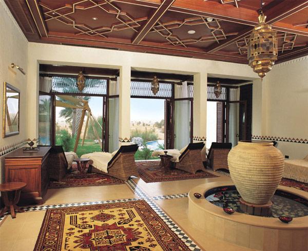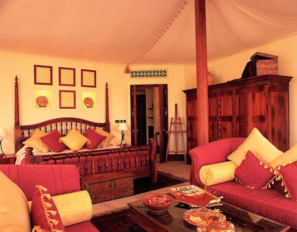 В архитектуре "шатров" использованы мотивы бедуинских жилищ, все материалы натуральные и превосходного качества. Для усиления переживания пустыни одна из стен шатра выполнена французскими окнами, которые создают иллюзию полного единения с природой. Выдержанные в "пустынных" тонах охры, апартаменты обставлены резной мебелью ручной работы, отделаны мрамором и золотом, декорированы роскошными тканями. Дизайн интерьеров цитирует традицию арабского жилья, одновременно создавая атмосферу сдержанной роскоши и безупречного комфорта. С тенистой террасы можно увидеть идущих на водопой антилоп и газелей.