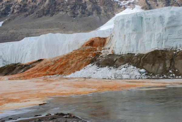 В Антарктиде из ледника Тейлора временами выходит Кровавый водопад. Вода в нём содержит двухвалентное железо, которое, соединяясь с атмосферным воздухом, окисляется и образует ржавчину. Это и придаёт водопаду кроваво-рыжий цвет. Однако двухвалентное железо в воде возникает не просто так — его производят бактерии, живущие в изолированном от внешнего мира водоёме глубоко подо льдом. Эти бактерии сумели организовать жизненный цикл при полном отсутствии солнечного света и кислорода. Они перерабатывают остатки органики, а «дышат» трёхвалентным железом из окружающих пород.