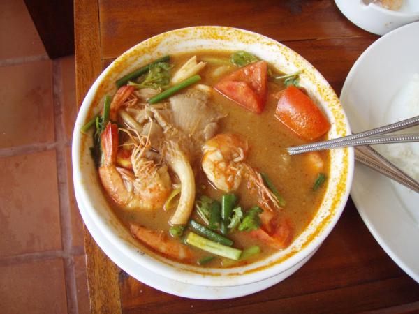 Ну и конечно же нельзя забывать о ресторанах любого уровня, где проголодавшихся угостят всем, что они пожелают. Самые простые блюда, которые продают на улицах, - это супы. Также часто готовят здесь кэрри из риса с курицей, тайских ресторанах вы до конца поймете, как далеко простирается фантазия местных поваров. Композиция типичного тайского ужина на 4-5 персон, как правило, включает в себя один из многочисленных вариантов кэрри, обязательный суп, одно запеченное или приготовленное на гриле блюдо, салаты, десерт и фрукты, а также непременный рис. Официанты в крупнейших ресторанах и больших отелях в Бангкоке получают специальное образование. Сервировка стола в дорогих ресторанах ничем не отличается от европейской, кроме того, что еще добавляются палочки и китайская фарфоровая ложечка для супа. В тех случаях, когда подаются ложка и вилка, едят ложкой, а с помощью вилки на нее накладывают пищу. Все блюда приготовлены так, чтобы без затруднений их можно было доставить с тарелки в рот при помощи обыкновенной ложки.