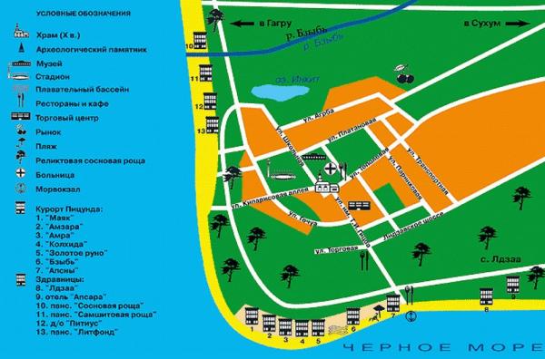 В отличие от города Гагра, Пицунда представляет собой небольшой курортный поселок, центром которого является комплекс высотных пансионатов «Курорт Пицунда». Здесь Вас ждут многочисленные кафе и рестораны, магазины и дискотеки. В течение всего сезона на курорте выступают национальные и эстрадные коллективы. В августе в Курорте Пицунда ежегодно проходит грандиозный праздник Нептуна, в котором принимают участие тысячи туристов со всей Пицунды. При всем многолюдьe Пицунды туристы не ощущают скученности и тесноты на обширной территории поселка. На живописных лугах в его окрестностях пасутся стада, зеленеют мандариновые и апельсиновые рощи, серебрятся на солнце листья экзотического дерева фейхоа. На пицундском рынке, расположенном в центре поселка, всегда изобилие свежих овощей и фруктов. По территории поселка курсируют маршрутные и частные такси. Восточнее поселка Пицунда, в пицундской бухте, расположено небольшое село Лдзаа, на территории которого также находится несколько курортных объектов.