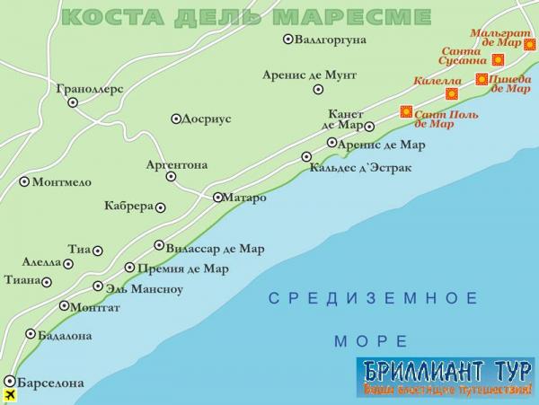 Пляжи Коста-дель-Маресме длинные и узкие, и часто отделены от одноимённых городов железной дорогой или загруженной автотрассой №11, проходящей параллельно побережью. Поезд – действительно очень удобное средство передвижения между курортами, если Вы не хотите застрять в одной из пробок на дороге. Вдобавок к этому, можно воспользоваться водным транспортом – катерами.