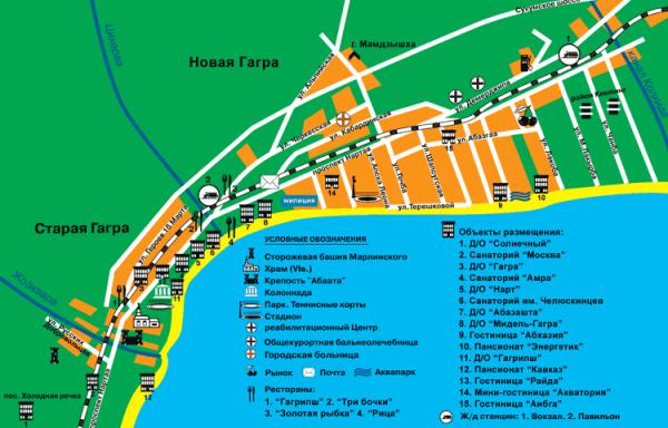 Современная Гагра – уютный курорт, известный своими живописными набережными и парками, утопающими в зелени цветов, пальм и кипарисов. Восхитительной особенностью Гагры является то, что горы здесь близко подступают к побережью, окаймляя пляжи яркой растительностью. Особенно красив район Старой Гагры, где с берега открывается чудесный вид на горы, ущелья и бухту. Горы, увенчанные снеговыми башлыками, создают свой микроклимат, защищая город от холодных ветров и удерживая теплое морское дыхание. Из-за контрастности высот, горные ущелья вентилируют и обновляют воздух в городе. Морская вода здесь кристально чистая и прозрачная. На тихих уютных пляжах вы сможете отключиться от суеты больших городов.