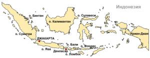 о. Суматра о. Ява о. Бали Денпасар о. Ломбок Джакарта о. Флорес о. Бинтан Ириан-Джая (западная часть острова Новая Гвинея) о. Сулавеси о. Калимантан