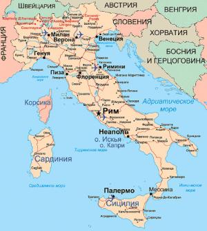 КЛИМАТ: климат северной Италии - континентальный: средняя температура летом +24 С, зимой +8 С. На юге Италии типичный средиземноморский климат с теплым и не дождливым летом: +28 С, зимой +12 С.